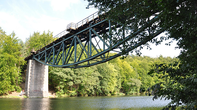 - dwa przęsła kratownicowe o pasach równoległych, górą otwarte z jazdą dołem, rozpiętość teoretyczna: 2×34,365m, długość eksploatacyjna: 72,23m – obiekt w ciągu linii nr 729